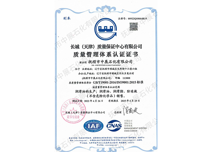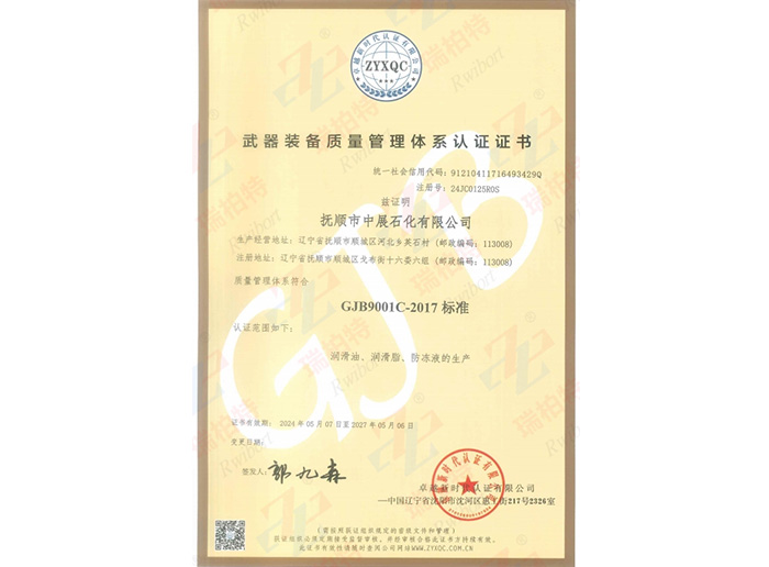本公司是GB/T19001-2016/ISO 9001:2015標(biāo)準(zhǔn)質(zhì)量體系認(rèn)證單位(注冊號:00922Q10664R1S),是GJB9001C-2017標(biāo)準(zhǔn)武器裝備質(zhì)量管理體系認(rèn)證單位。撫順在上個(gè)世際五十年代就已是我國軍用油脂的生產(chǎn)基地,本公司正在發(fā)揚(yáng)和繼承這一優(yōu)良傳統(tǒng),全力投入于各種軍用、航空油脂的生產(chǎn)與研發(fā)。